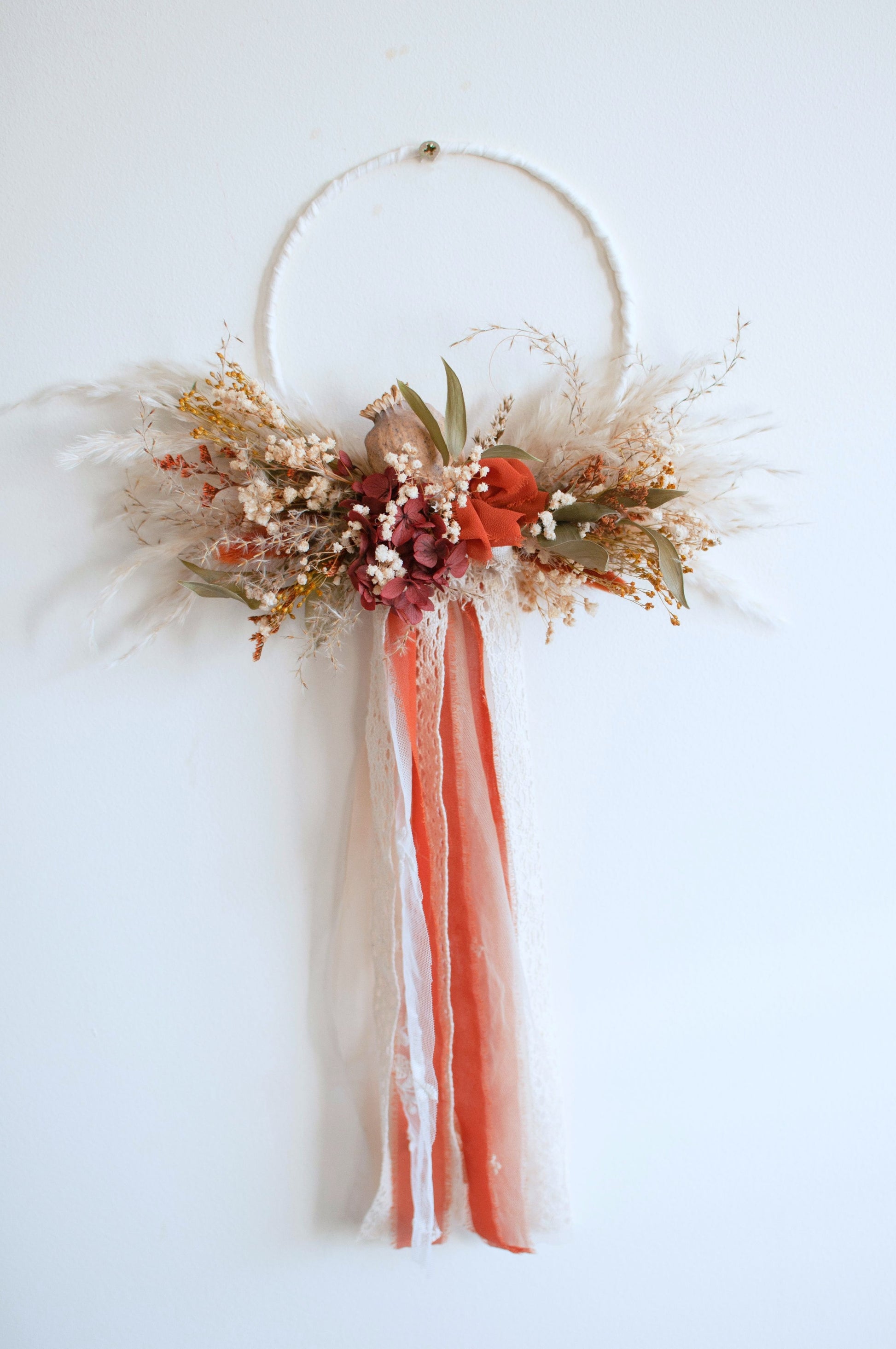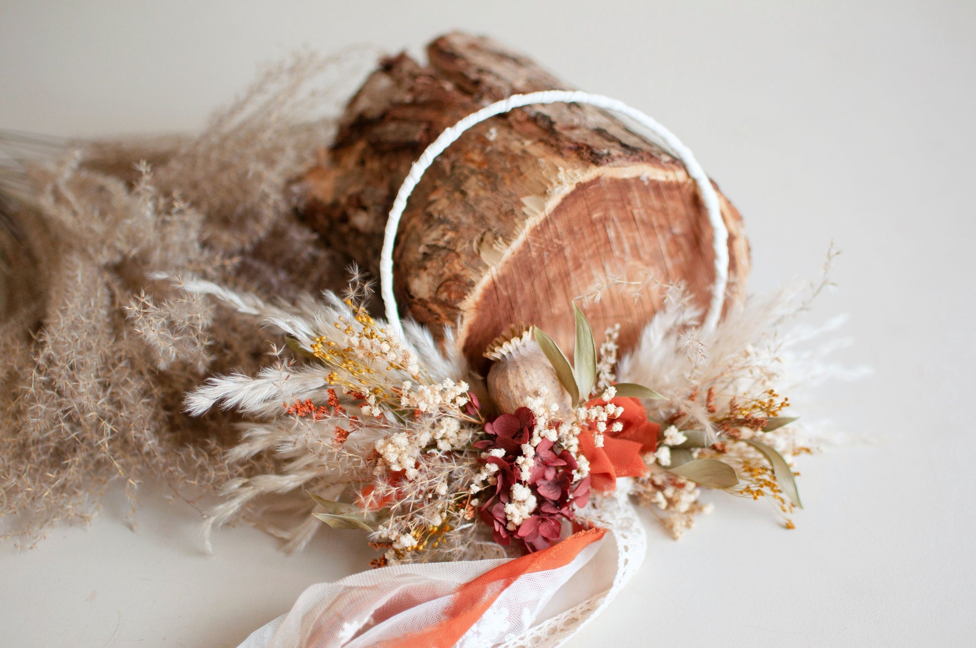 Beautiful autumnal style flower girl hoop with dried flowers and ribbons.