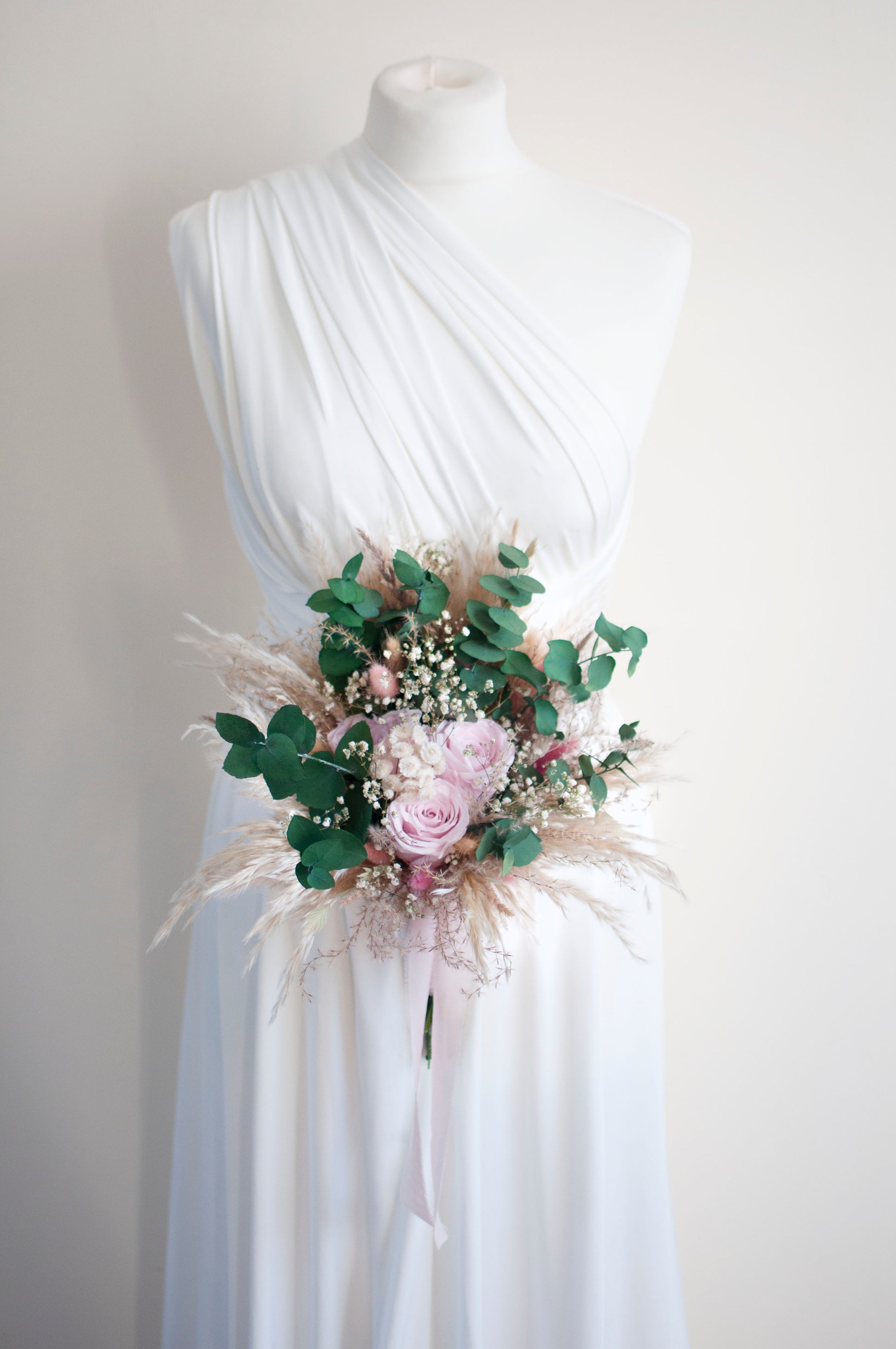 Combination of preserved eucalyptus, preserved rose heads and dried gypsophilia, wrapped in chiffon ribbon.