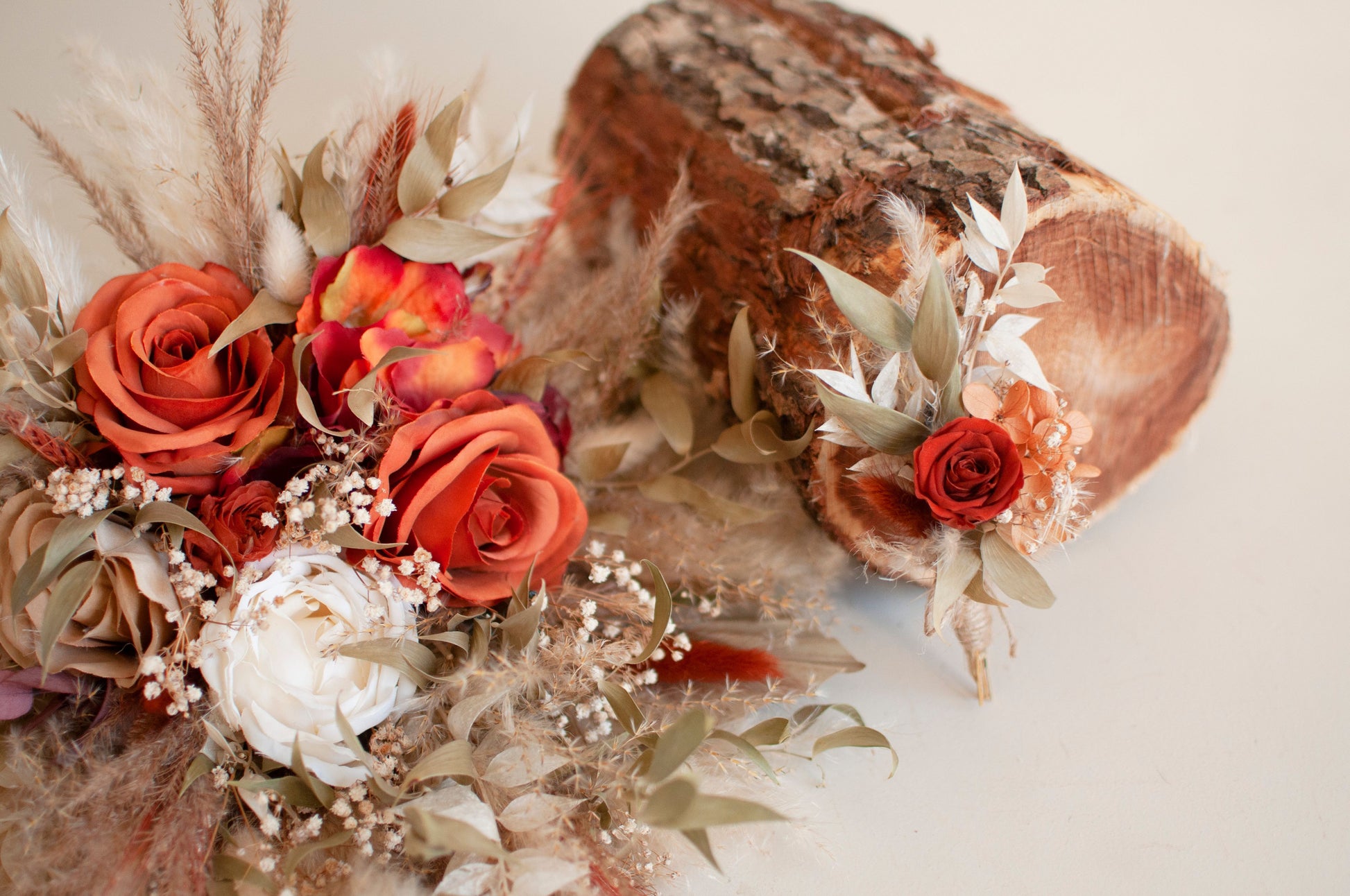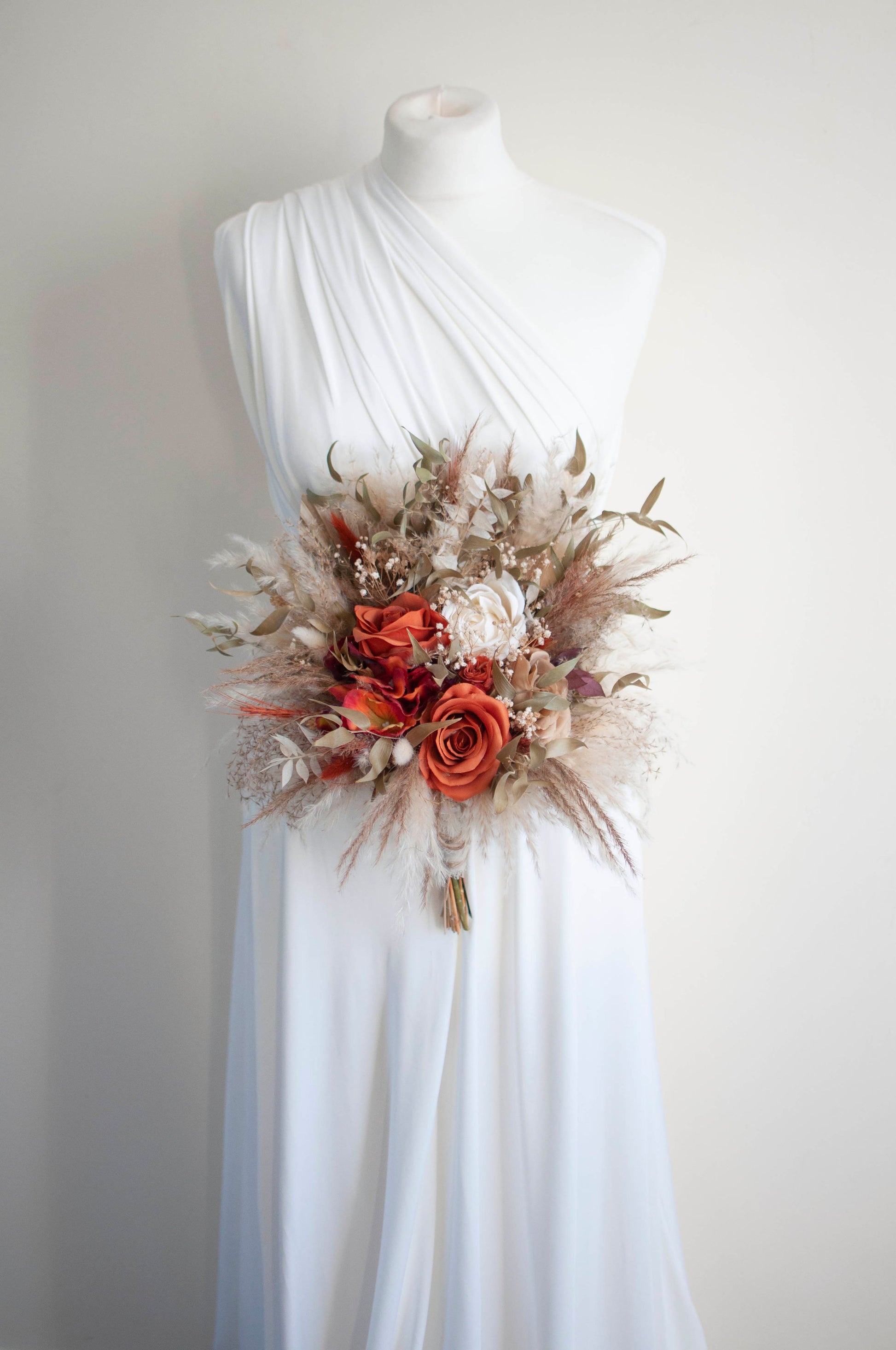 Combination of pampas grass, dried eucalyptus, faux and preserved wrapped in cotton ribbon & jute twine