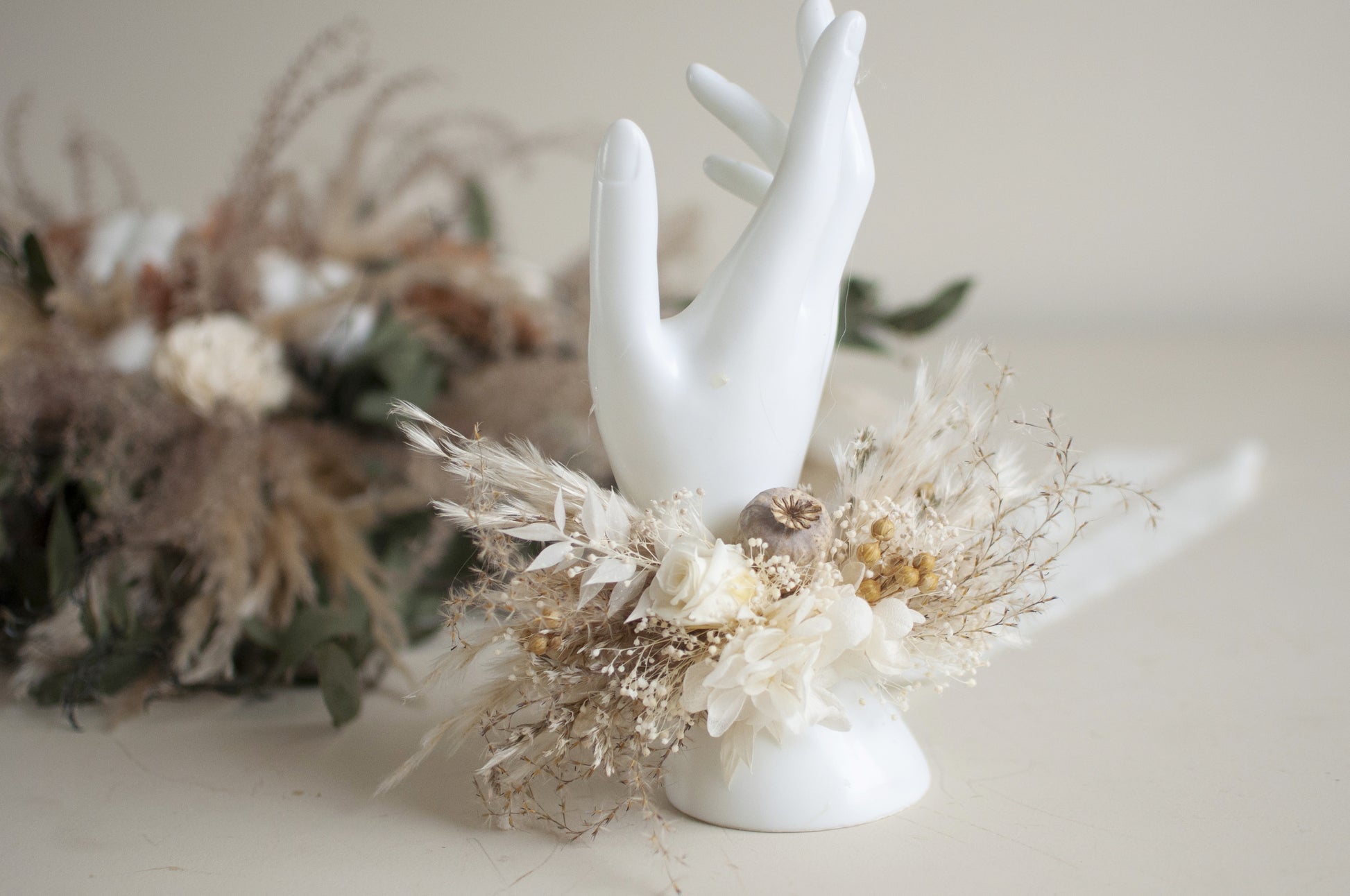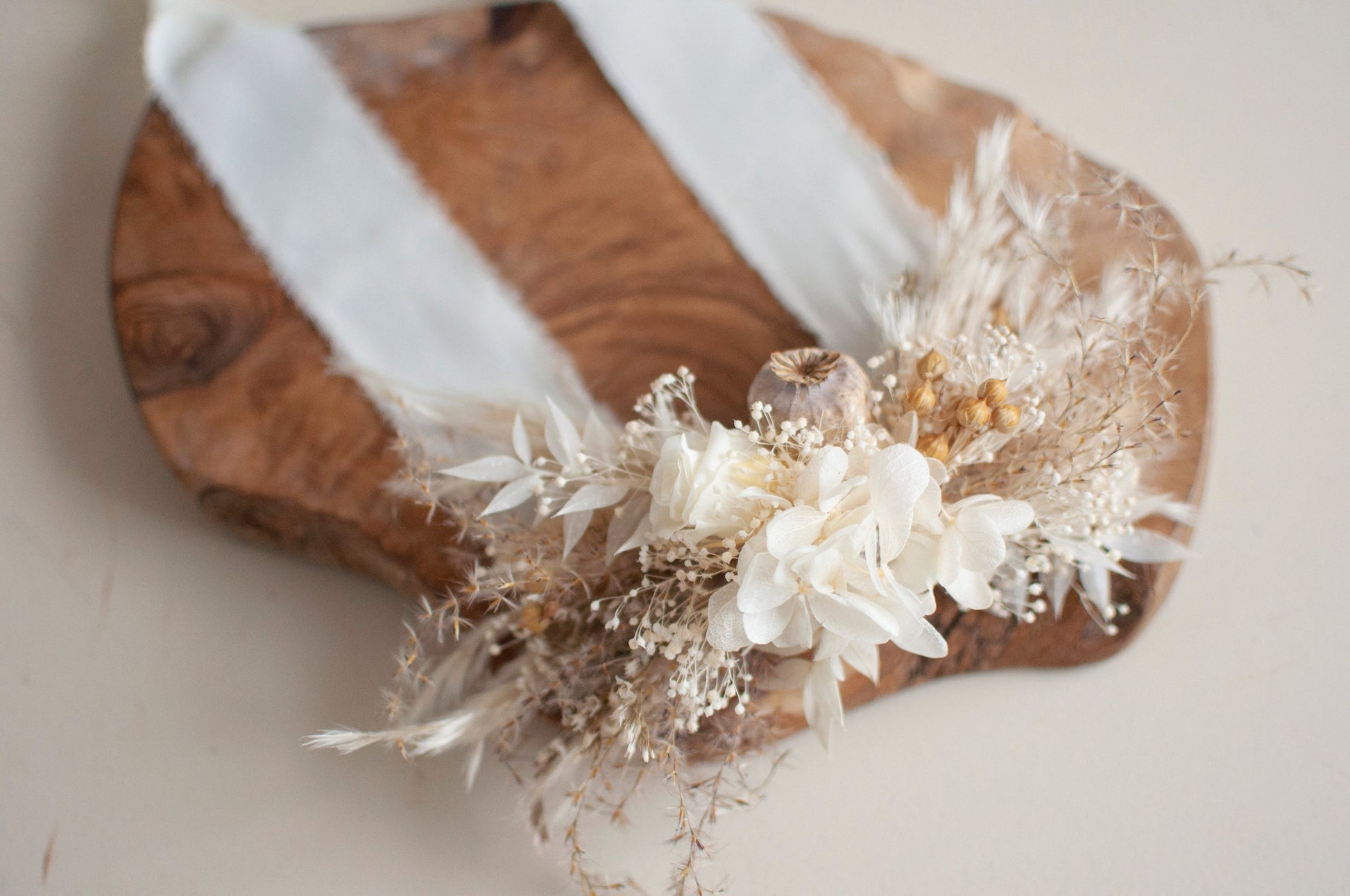 Beautiful combination of dried flowers fitted on a chiffon ribbon in ivory colour.